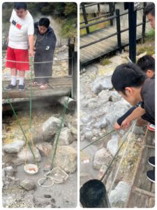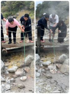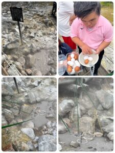 スタッフと一緒に地中からゴボゴボと音をたて湧き上がる熱湯に卵を入れ、10分ほどの我慢!!