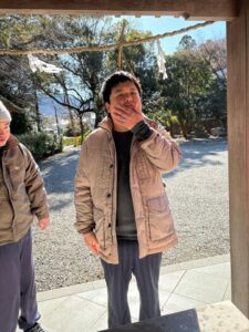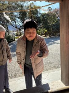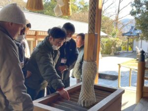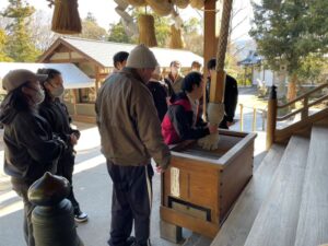 三人の代表者にお賽銭を投げてもらいみんなでお参りしました。(二礼二拍手一礼できたかな?)