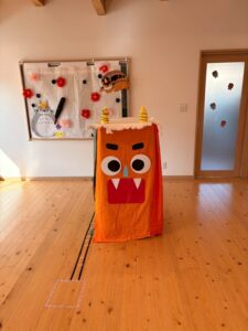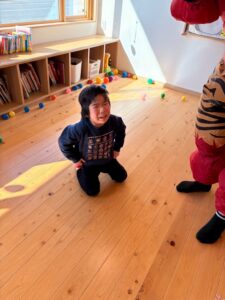 さぁ小鬼探しの後はいよいよ豆(カラーボール)まきです!今年は子どもからのリクエストで段ボールの鬼