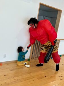 怖がりながらもボールを遠くから投げたり鬼さんと何やらお約束をしたりして、「また来年〜」と手を振ってお別れしました(^^)