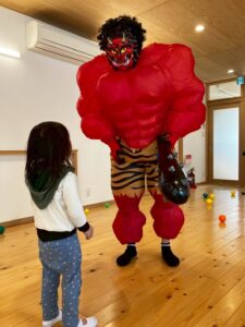 「鬼は〜外!!」「えいっえいっ!」と投げていると…なんと中から動く鬼が登場です!